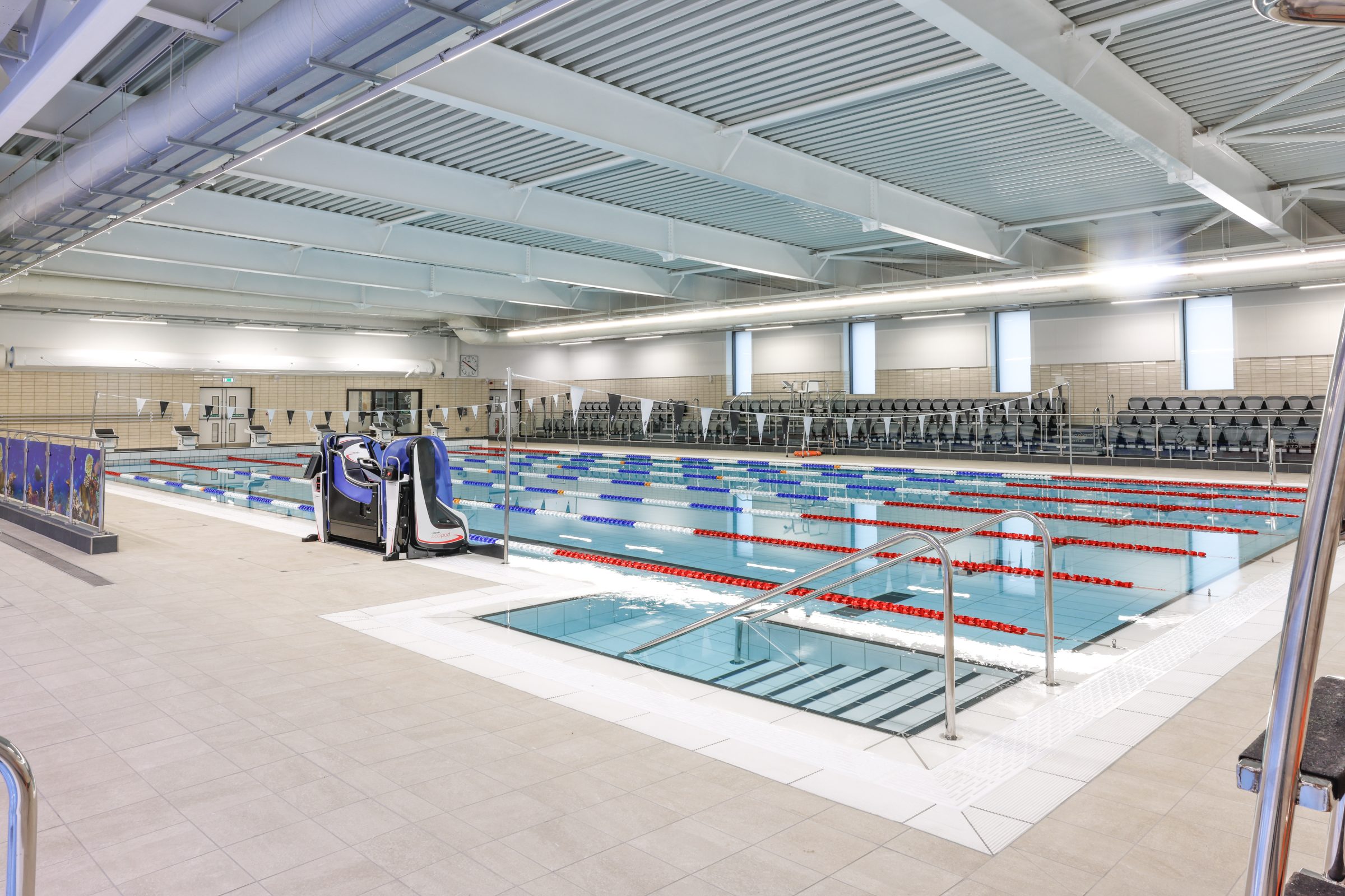 This new swimming pool facility, part of the wider Eston Leisure Centre, was completed 6 years after the previous pool has to close due to flooding of the subterranean plant room. BGP was responsible for all structural design and detailing of the steel framed structure and the many below ground water retaining concrete tanks associated with swimming pools. The facility provides a 6-lane 25 metre main pool with associated diving blocks ensuring the site can host competitions and galas. An 11x7m learner pool with sensory lighting will provide the perfect environment for the youngest of swimmers and is fully accessible with the equipment to ensure that is available for all.